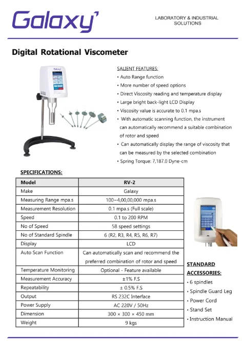 The Digital Rotational Viscometer RV is a high-performance laboratory instrument designed for accurate and repeatable viscosity measurement of liquids and semi-fluids across a wide range of industries.