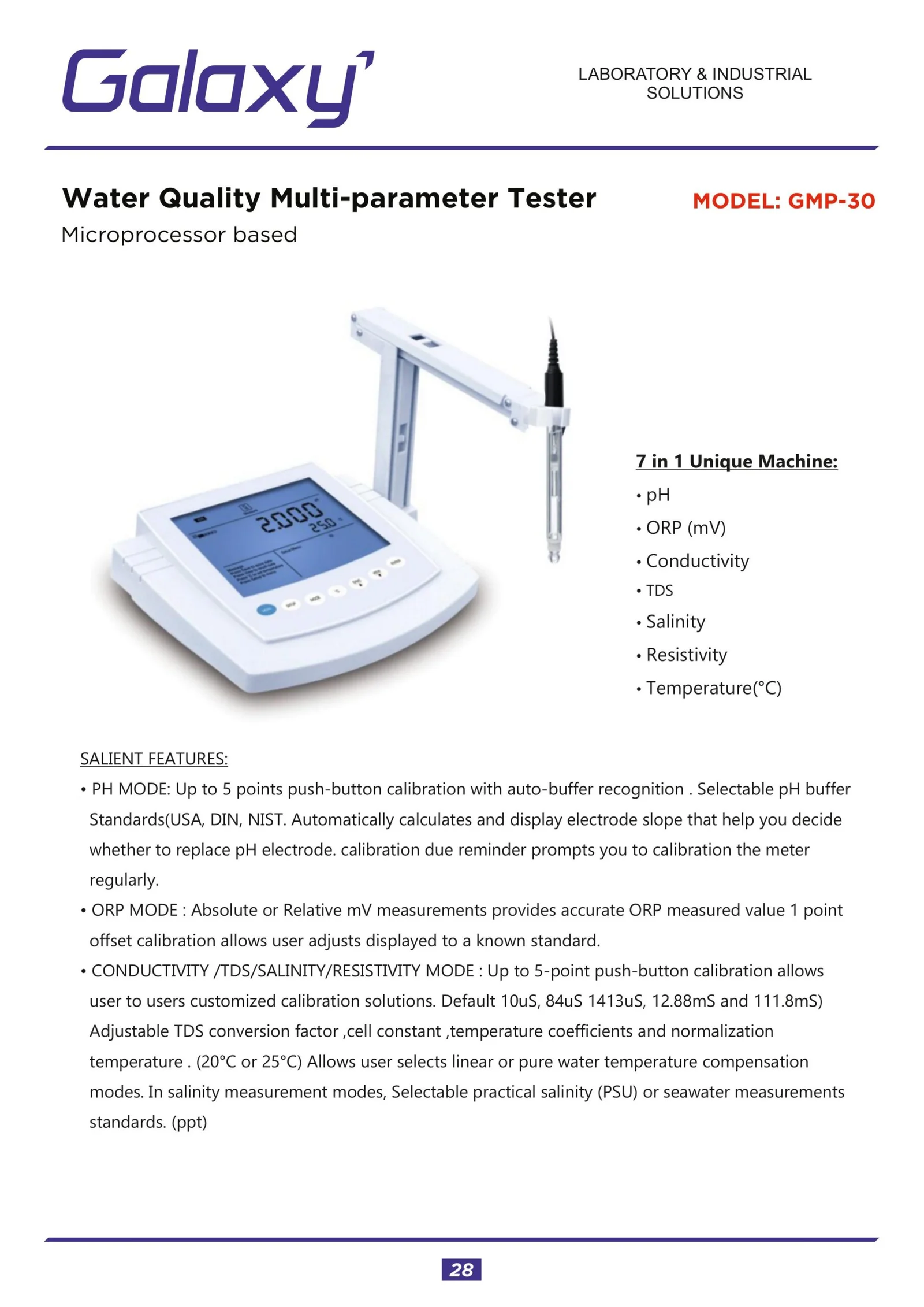 Galaxy GMP-30 is a unique 7 in 1 multiparameter machine that accurately measures PH, TDS, EC, Temp., ORP, Salinity, Resistivity. Equipped with advanced sensing technology, this meter offers accurate and reliable measurements in a compact and user-friendly design.