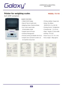 TX-110 is the best printer for weighing scales. This device is a dot matrix based printer with ability to print date, time, sample name, id, editable title, editable tail. All these function with addition to authority management makes it a favorite among lab users.