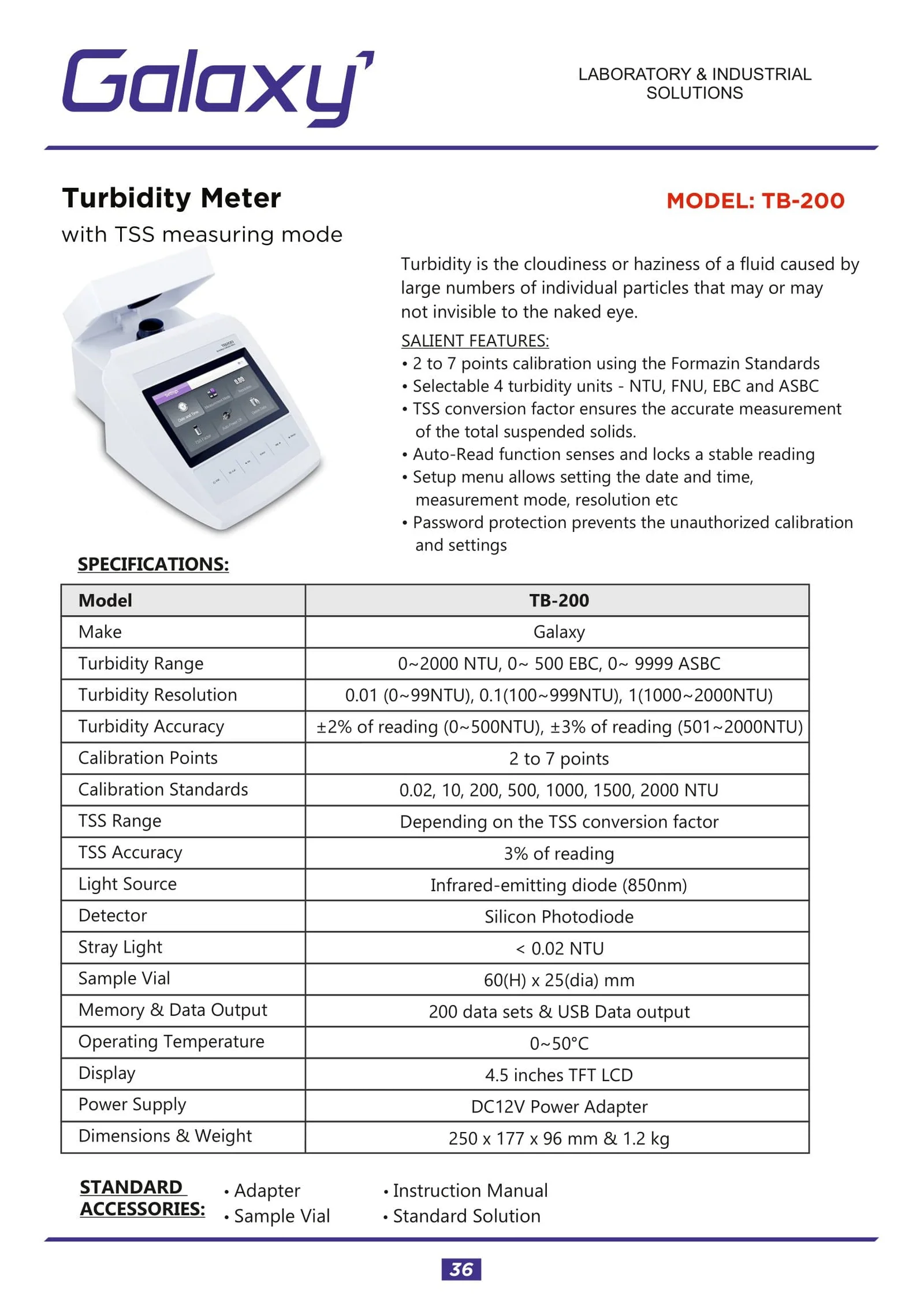 Galaxy TB-200 Turbidity Meter is a top quality smart device which has a calibration of up to 7 points. Wide measuring range, 4 units, TSS mode & password protection make it an incredibly useful device for laboratories.